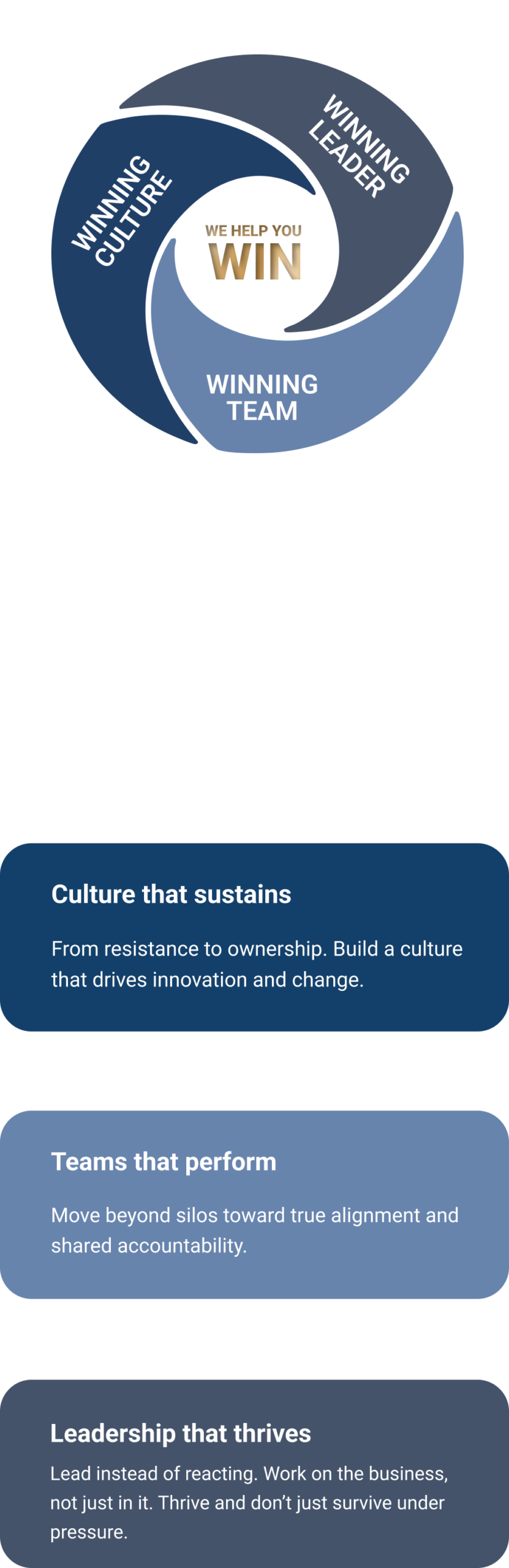 We elevate leadership to the next level, unlock real team performance, and anchor a winning culture that withstands pressure and drives change.